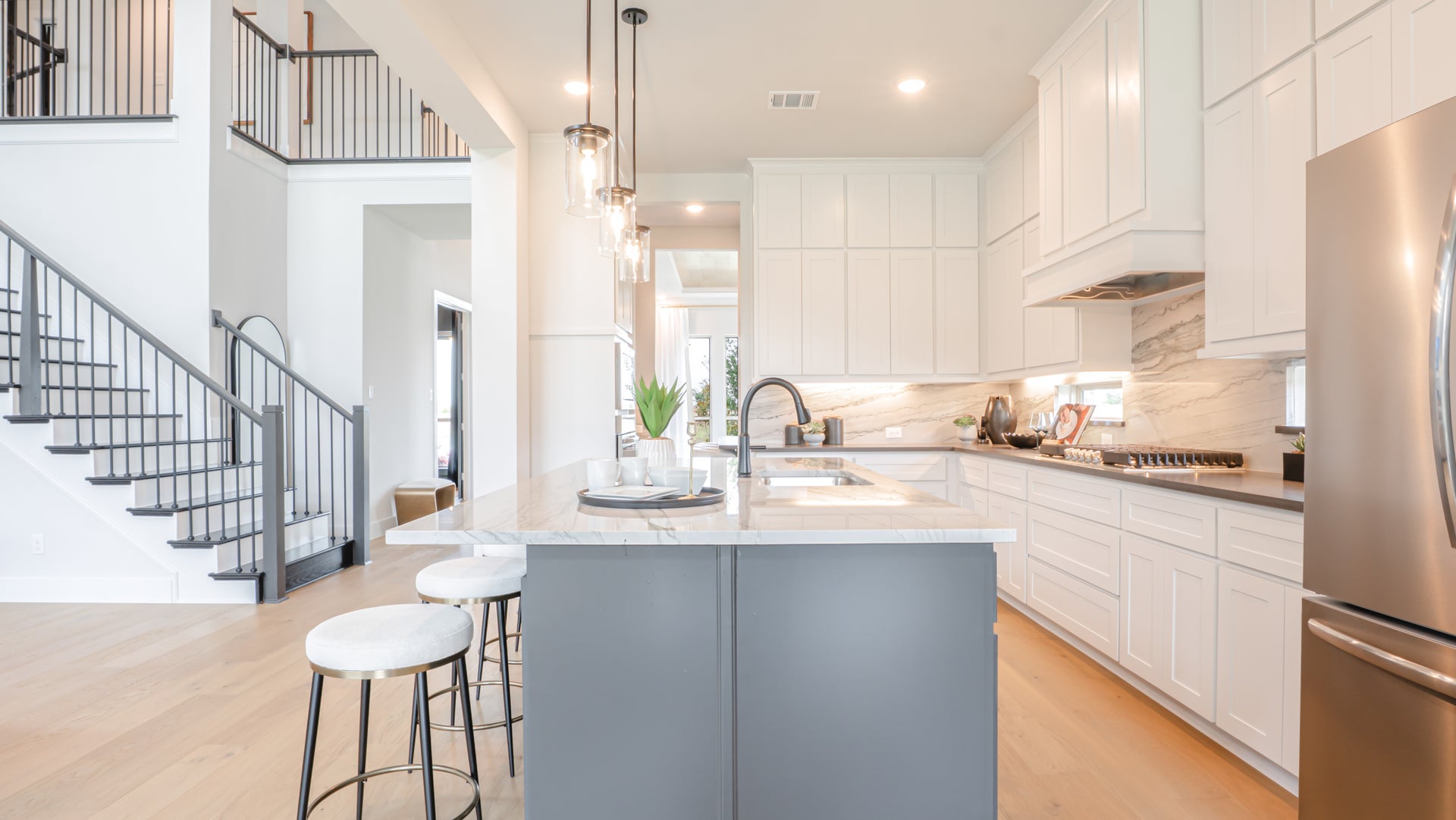Disclaimer: Upgrades, such as the circular staircase, butler’s pantry, California kitchen, freestanding bathtub in the primary bathroom, 3x4 shower in the primary bathroom, and squared wall windows, are plan-specific and may not be available on every floorplan. Featured upgrades may not be available on Select Series floorplans. Additionally, linear electric fireplaces may not be available in all communities.