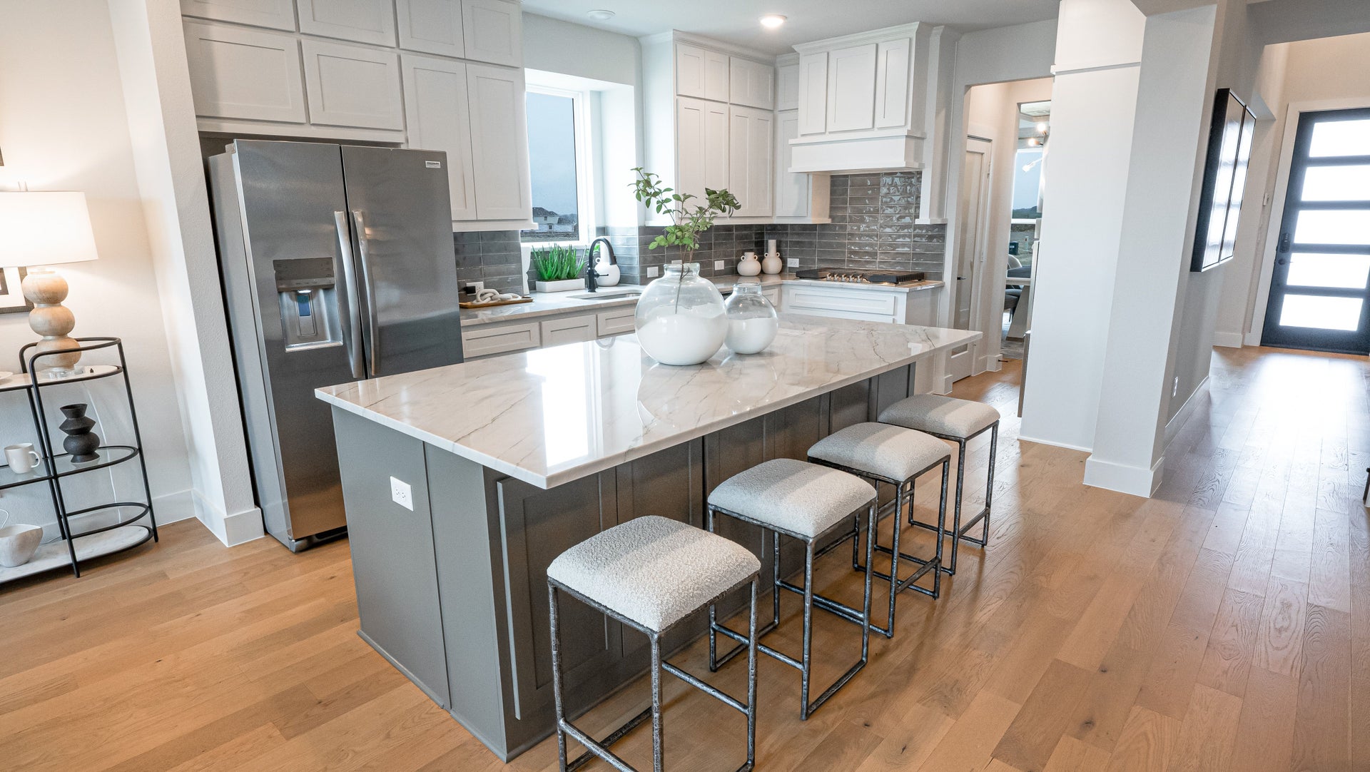 Disclaimer: Upgrades, such as the circular staircase, butler’s pantry, California kitchen, freestanding bathtub in the primary bathroom, 3x4 shower in the primary bathroom, and squared wall windows, are plan-specific and may not be available on every floorplan. Featured upgrades may not be available on Select Series floorplans. Additionally, linear electric fireplaces may not be available in all communities.
